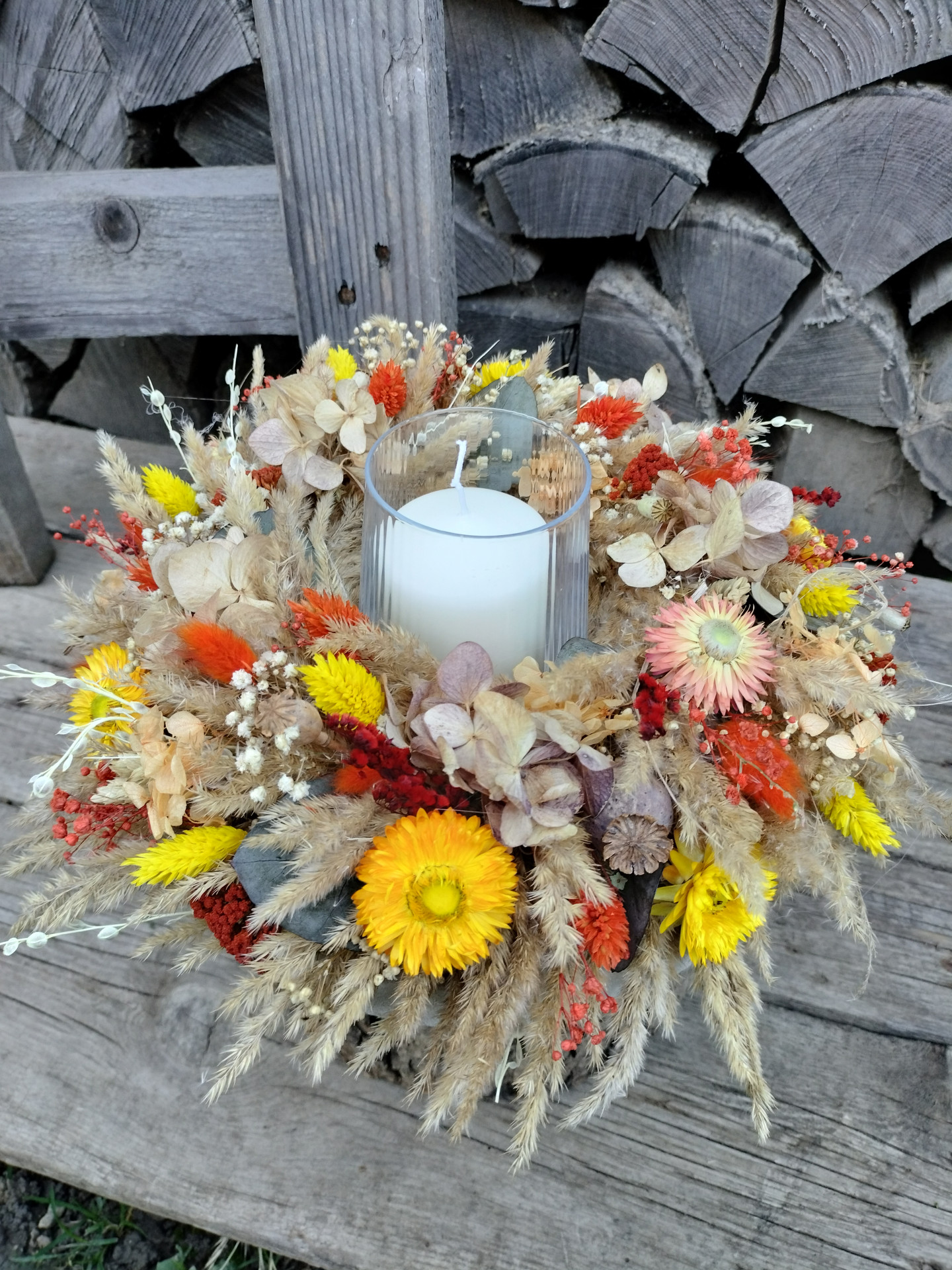Svientik z pampových tráv v kombinácii s hortenziou, sušenou aj stabilizovanymi kvetmi. Priemer 30cm. Tovar slúži iba ako dekorácia, nenechávajte horieť bez dozoru.