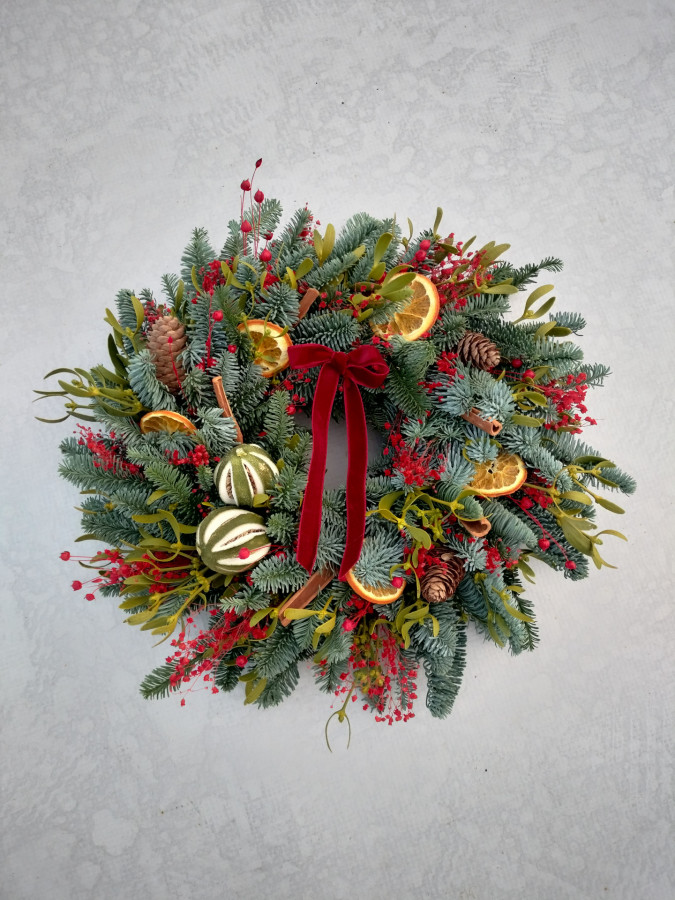 Prírodný veniec z nobilis čečiny. Priemer 40cm. Tovar slúži iba ako dekorácia.